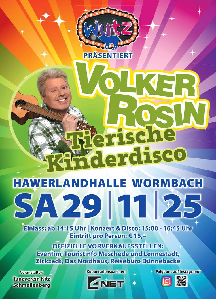 Mit seinem neuen Programm „Tierische Kinderdisco“ wird Kinderliedermacher Volker Rosin alle Kinder und Eltern in der Hawerlandhalle Wormbach zum Singen und Tanzen bringen. Das Konzert wird präsentiert von Winnie Wutz, dessen Song im Anschluss an das Konzert von allen gesungen und getanzt wird.