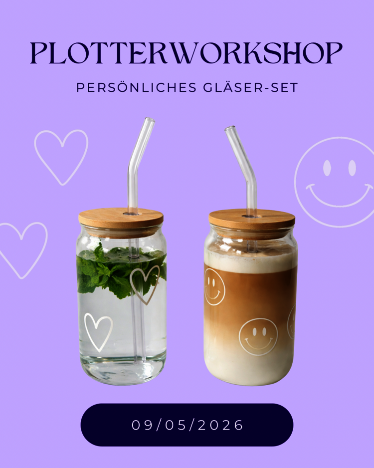 In unserem Workshop kannst du zwei Gläser individuell beplotten – die Gläser, Holzdeckel und Strohhalme stellen wir. Du musst nichts mitbringen und brauchst keine Vorkenntnisse. Du wählst aus einer großen Auswahl hochwertiger Folien und Farben, wir begleiten dich Schritt für Schritt bei Motivwahl, Design und Platzierung. Dabei lernst du die Grundlagen des Plottens, den Umgang mit der Software und den Materialien – so gehst du nicht nur mit zwei einzigartigen Gläsern nach Hause, sondern auch mit praktischem Wissen rund ums Plotten.